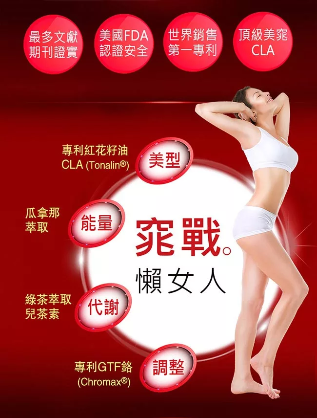 專利GTF鉻(Chromax®)、瓜拿那萃取、綠茶菁華萃取高單位兒茶素等,能啟動體內蘊藏的魅力因子,調節勻稱美型!